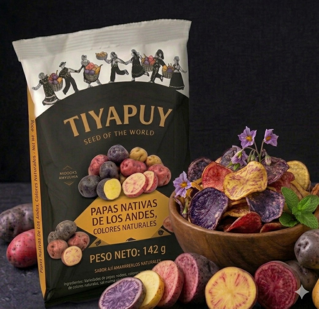 Disfruta una experiencia de sabor auténtico con las Papas Nativas Mixtas Tiyapui de 142 g, una selección premium de papas nativas orgánicas del Perú. Cultivadas en los Andes y fritas en aceite de girasol alto oleico, ofrecen una textura crujiente y un sabor natural incomparable.